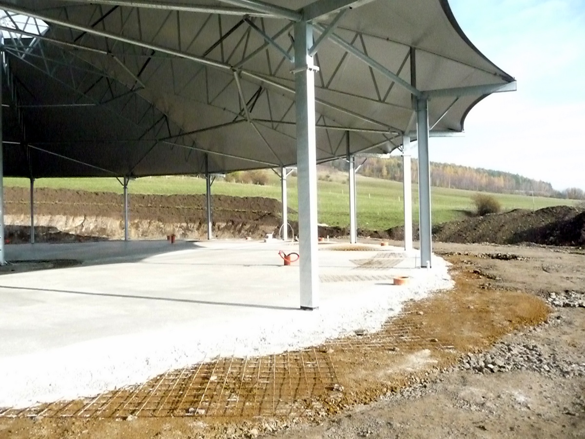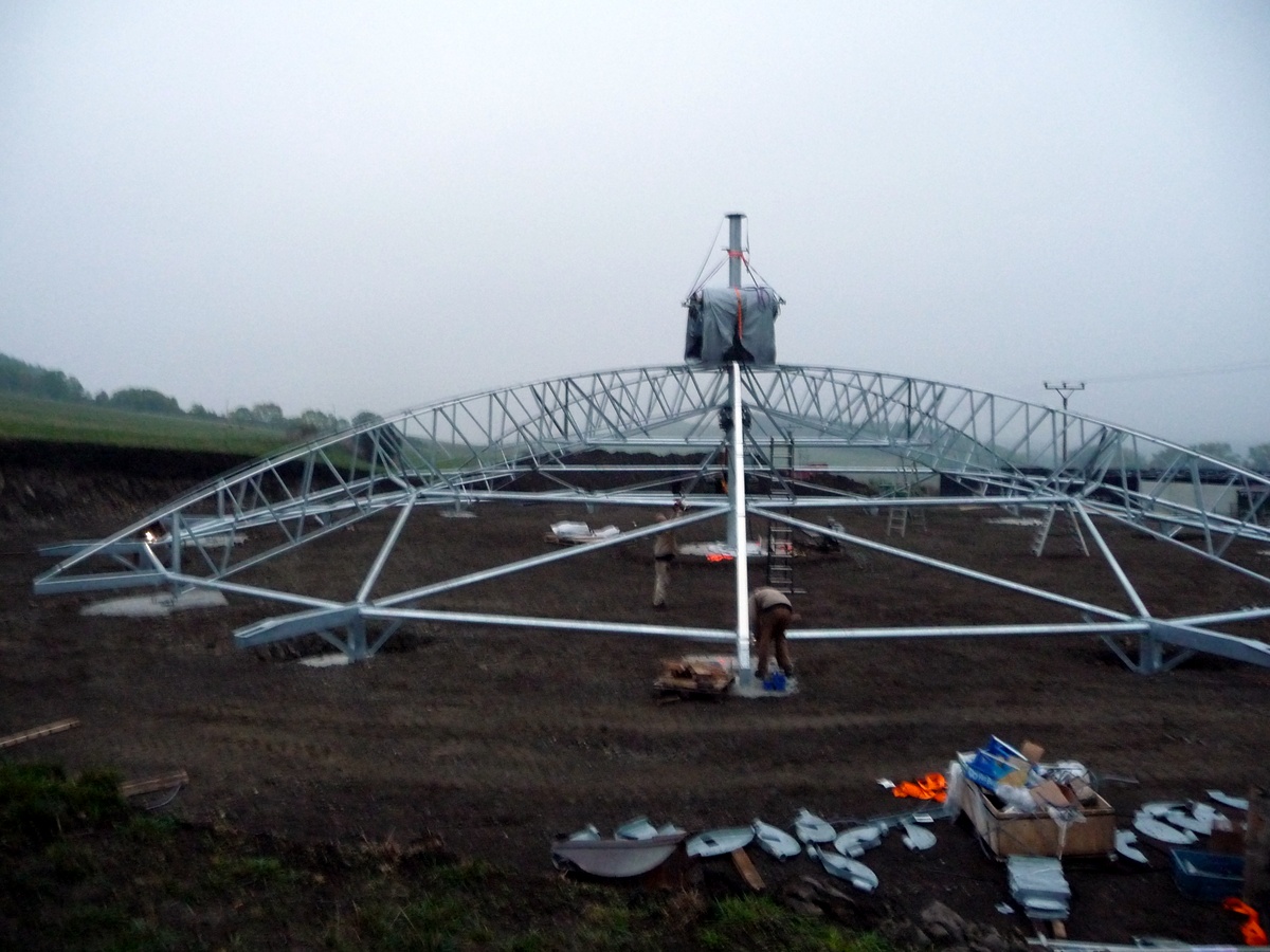Celkový čas výstavby lze zkrátit na minimum, protože se celá konstrukce včetně střechy montuje na zemi. Následně se hotová konstrukce zdvihne na centrálním pilíři a vzepře pomocí vnějších nosných sloupů. Vlastní montáž konstrukce a střechy stáje zabere pouhé čtyři dny. Největší část doby nutné pro výstavbu zaberou technologické přestávky při zrání betonových konstrukcí. Na konci roku 2020 jsme realizovali první stavbu lehké stáje Roundhouse® v ČR. Pokud máte zájem o více informací nebo Vás zajímá názor chovatele a jeho zkušenosti s provozem, neváhejte nás prosím kontaktovat.